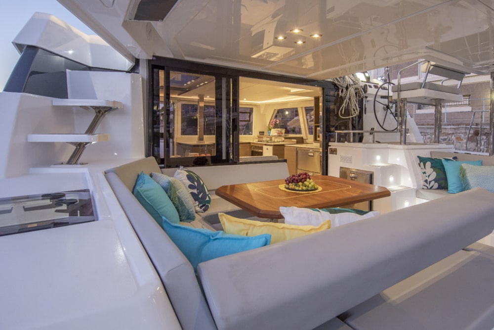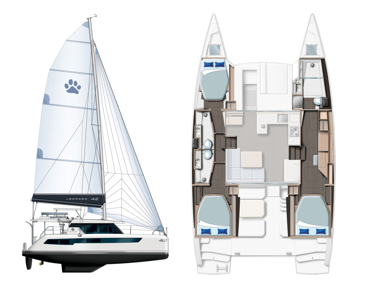 The Leopard 42 boasts an open-concept saloon with panoramic windows, a fully equipped galley, and a seamless indoor-outdoor living experience thanks to its aft cockpit and forward lounge area. High-quality construction, robust rigging, and top-tier navigation systems make it a reliable choice for extended offshore voyages.